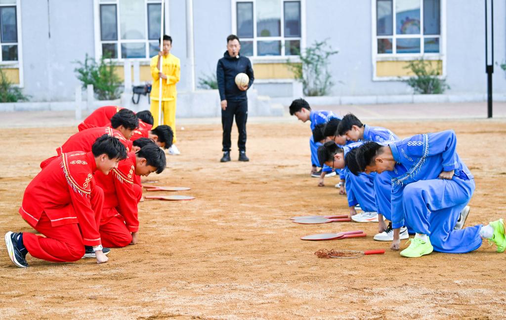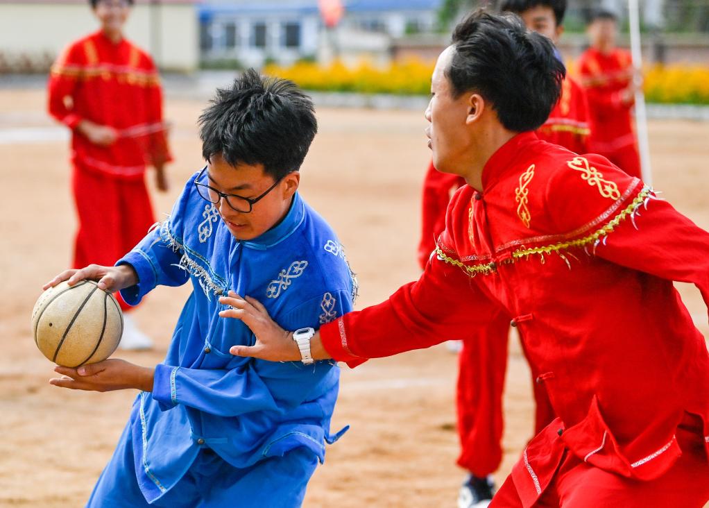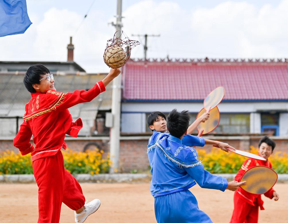 9月16日,乌拉街满族中学学生在比赛中争夺珍珠球。