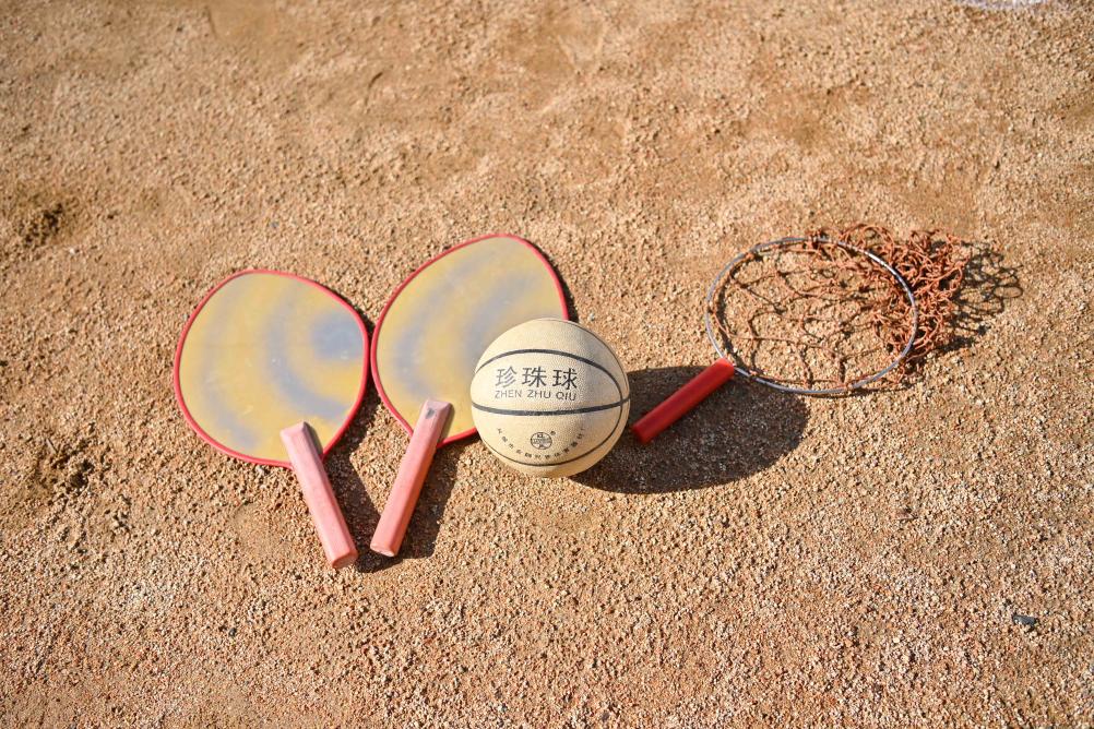 这是9月16日拍摄的珍珠球比赛中用到的球拍、珍珠球以及抄网。