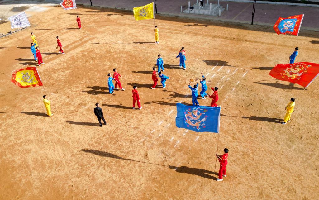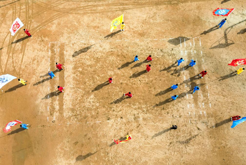 9月16日,乌拉街满族中学学生在操场进行珍珠球比赛(无人机照片)。