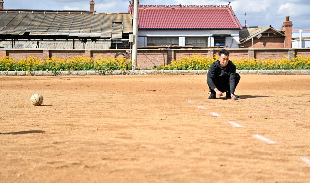 9月16日,乌拉街满族中学体育教师李明在操场上为珍珠球比赛场地画线。