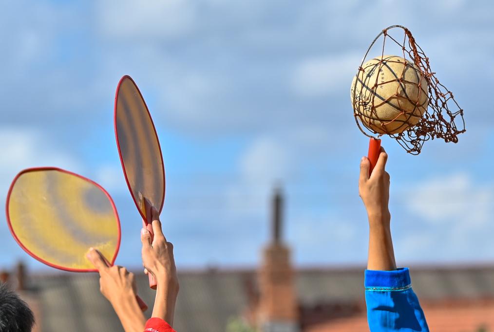 9月16日,乌拉街满族中学学生在比赛中接住珍珠球得分。