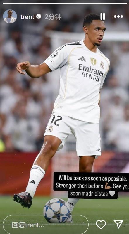 阿诺德写道:“我会尽快回归,变得比以前更强。很快再见,皇马球迷们。”