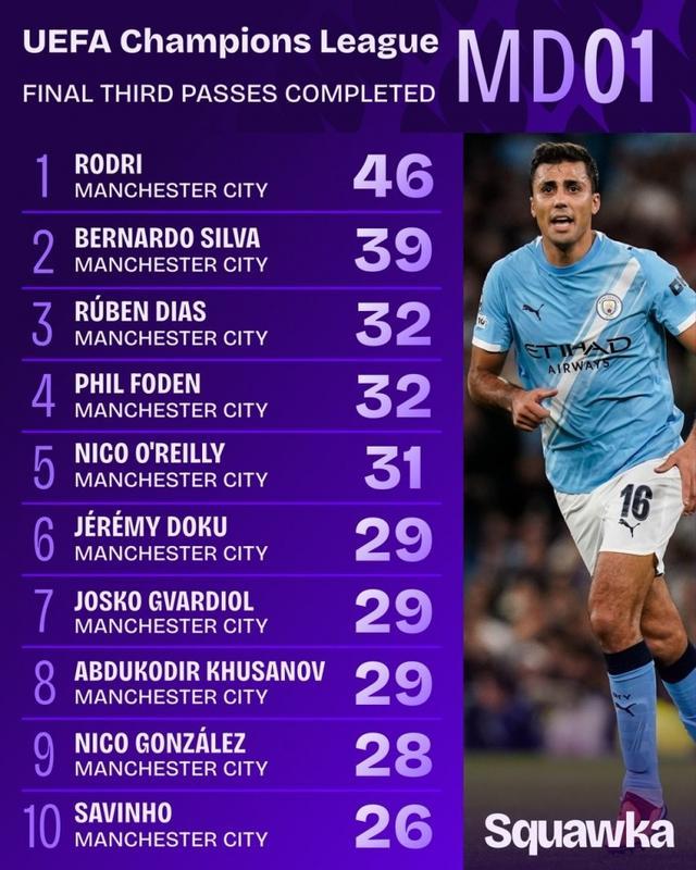 9月19日欧冠日报讯 著名数据网站Squawka统计了欧冠首轮进攻三区传球数据,罗德里46次居首,曼城球员包揽前十。